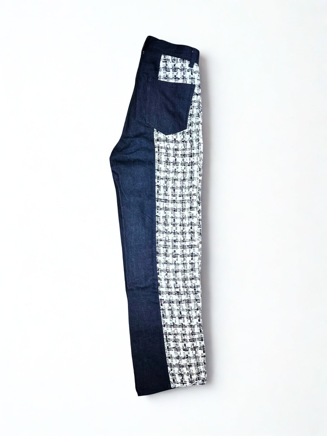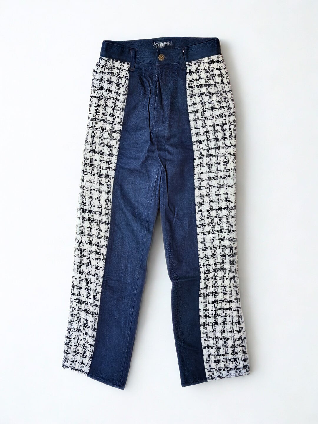 デニム素材にツイードを組み合わせた、スタイリングのアクセントになるパンツ。
